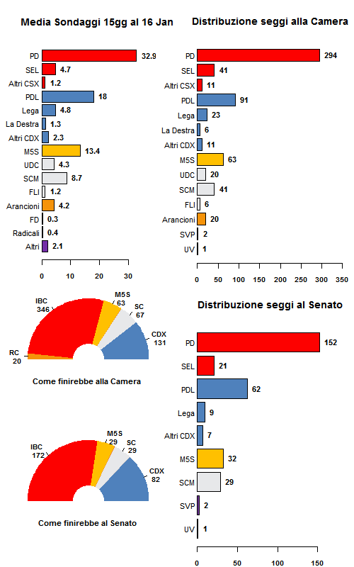 Una valanga di sondaggi ha colpito l'opinione pubblica in questa settimana, alcuni di questi effettuati anche a livello regionale e dei quali abbiamo tenuto conto nelle nostre medie al senato. Il centrodestra mostra qualche segnale di inversione di tendenza di un trend che e' stato nettamente negativo negli ultimi 6 mesi, ma le performance televisive del Cavaliere sembrano avergli dato un po' di fiato trascinando il PDL dal 18.2% della scorsa settimana al 19% tondo di oggi. In ripiegamento il PD dai suoi massimi raggiunti in occasione delle parlamentarie ma ancora tonico sfiorando il 33% mentre il trend della coalizione rimane tutto sommato positivo. In forte ascesa invece Scelta Civica che arriva a sfiorare complessivamente il 15%. A picco invece le quotazioni del Movimento di Grillo, a nostro modesto parere in difficoltà preso nella morsa del ritrovato protagonismo di Berlusconi e della Rivoluzione Civile di Ingroia. Quest'ultimo movimento oscilla attorno alla soglia di sbarramento del 4% ben lontano pero' dalle potenzialità che quell'area aveva qualche mese fa. Il computo dei seggi da' ancora in netto vantaggio al Senato la coalizione Italia Bene Comune, ma i numeri non debbono trarre in inganno: Lombardia e Veneto nelle nostre proiezioni sono 2 regioni realmente toss-up con uno scarto a favore del Centrosinistra di pochi decimi di punto e anche la Campania nonostante la si possa considerare leaning csx e' contendibile dalla coalizione berlusconiana